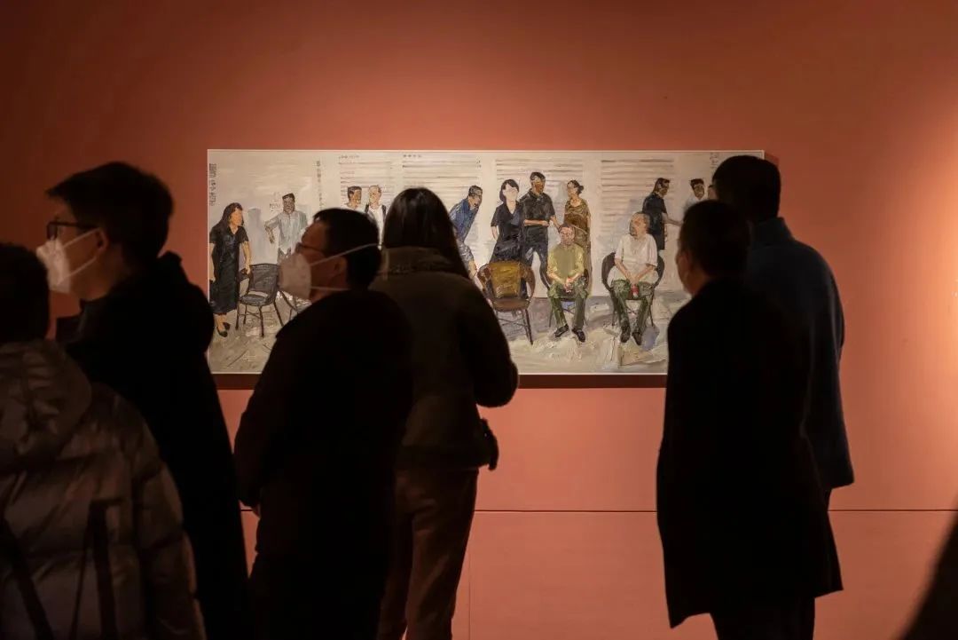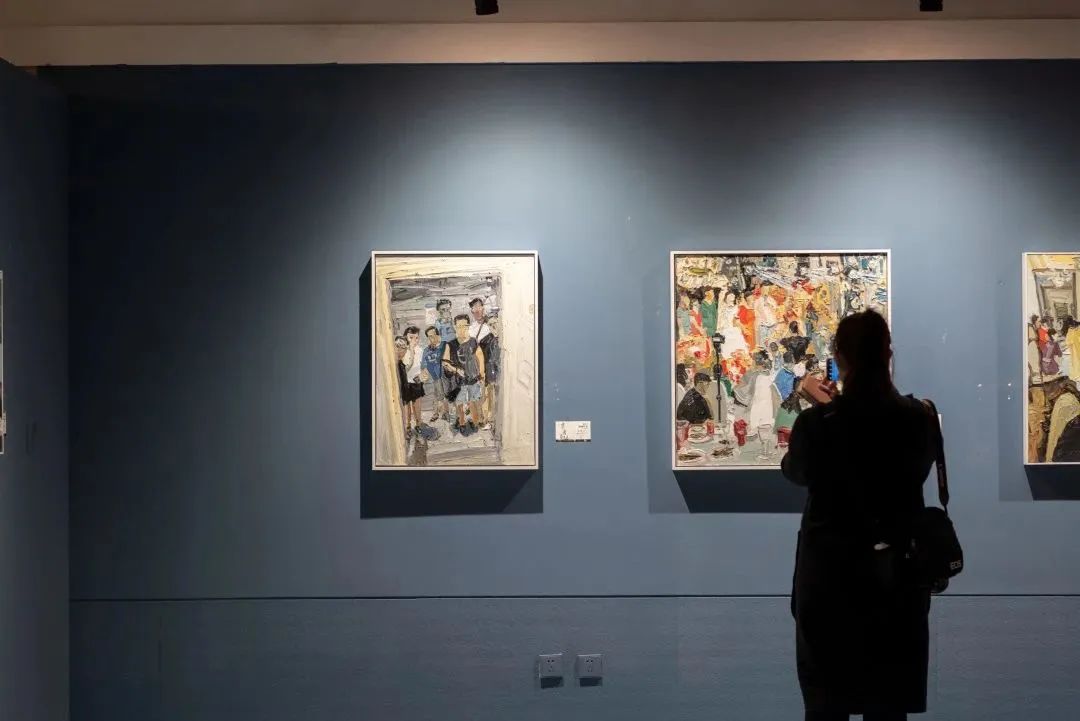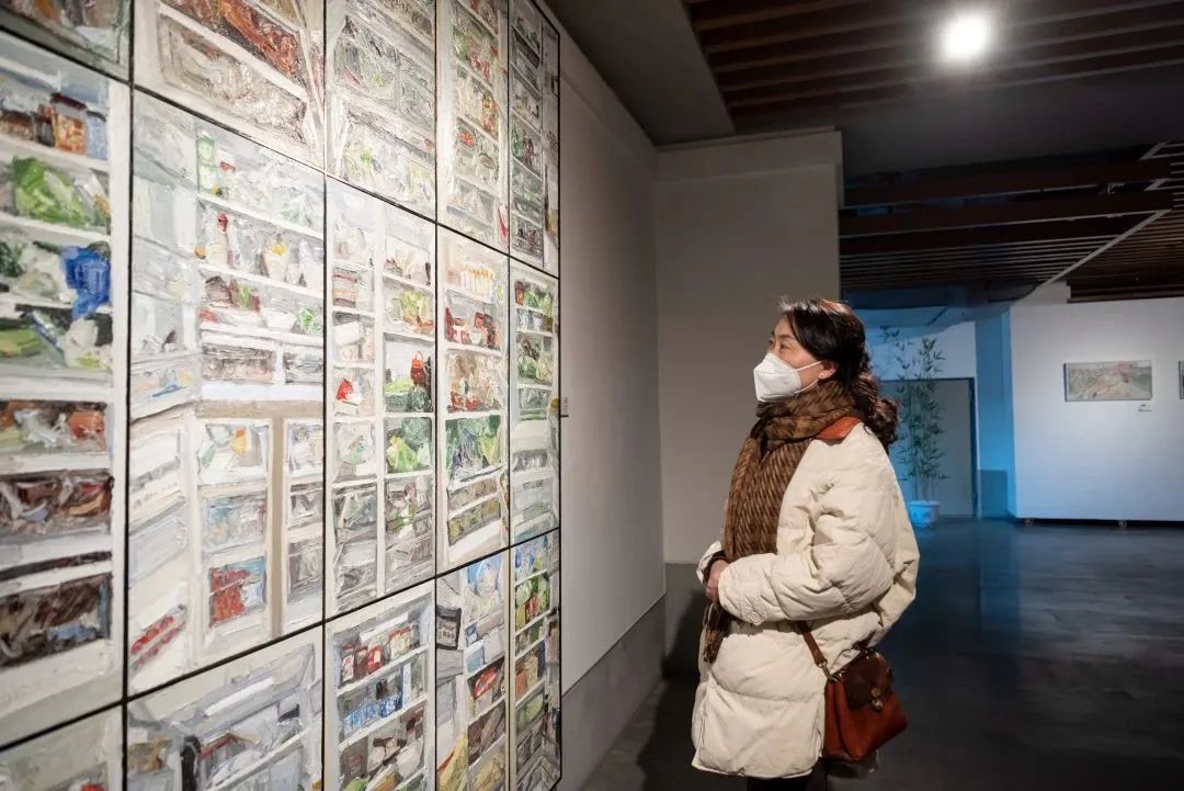 展览现场,大部分画作来自潘闻丞的近两年的“朋友圈”。作品《请坐》是朋友发在朋友圈、来自不久前在孔学堂举行的曹琼德画展,画面中各位画家在合影时相互谦让的热闹场景,作者本人、耿翊、曹琼德、谌宏微,还有画展主持人周之江等多位好友,皆入画;他和好友们一起《烧烤》、共同《宵夜》,一起《听琴》《写生》,用写意的手法把一张张油画定格一幕幕美好瞬间,生活味十足,充满了烟火气息。近二十幅取材朋友们圈的作品《九月·贵阳冰箱》,记录着特殊时期的温暖和感动……