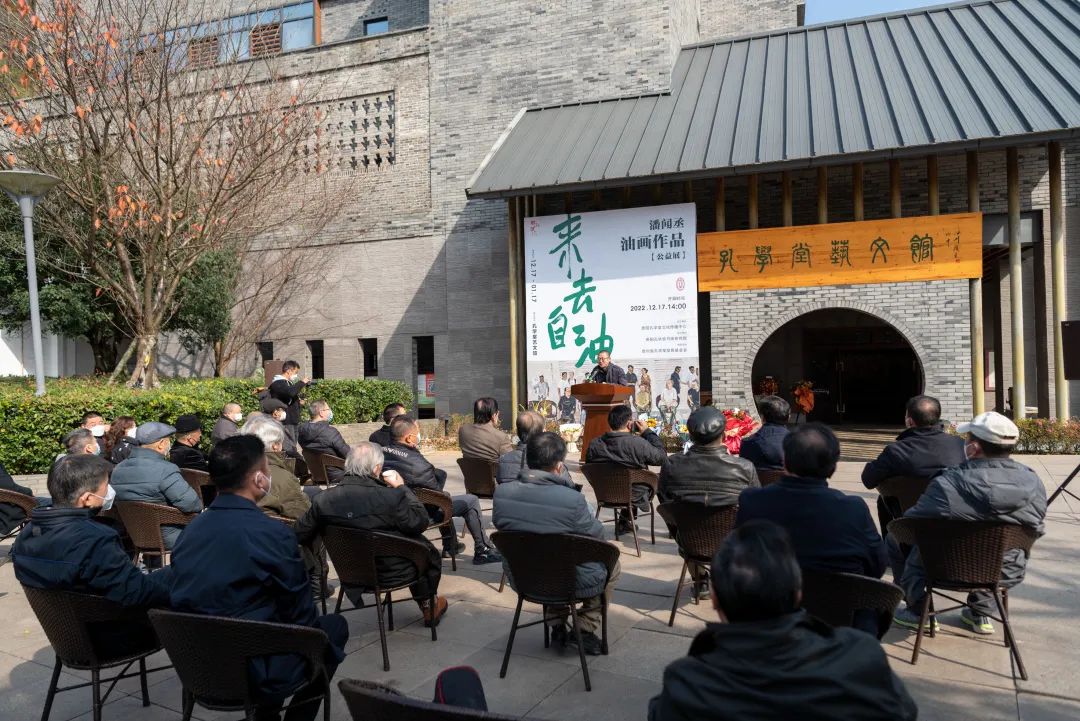 该展由贵阳孔学堂文化传播中心主办,贵阳孔学堂书画研究院承办。现场贵州大学党委书记李建军宣布开展;贵阳孔学堂文化传播中心副主任周之江主持说,潘闻丞的油画展取名“来去自油”,出自他自己的创意。艺术家将所见所闻化为创作的素材,而又不失温暖亲切,生趣顿出,这也许就是所谓的“自由”,在艺术里来来去去的“自由”。