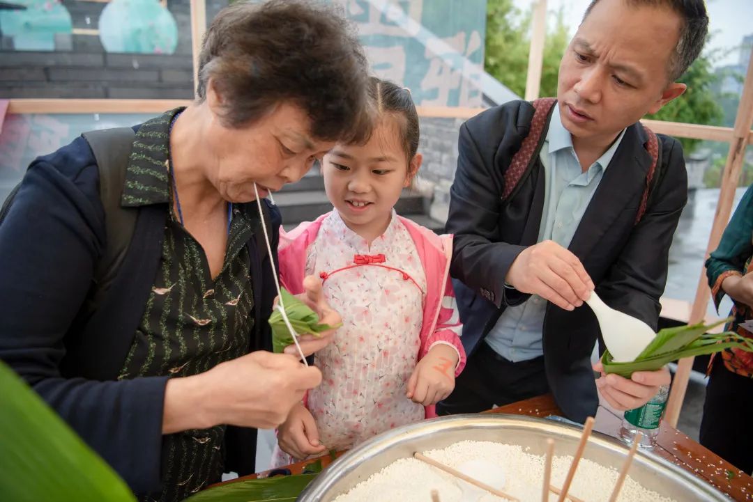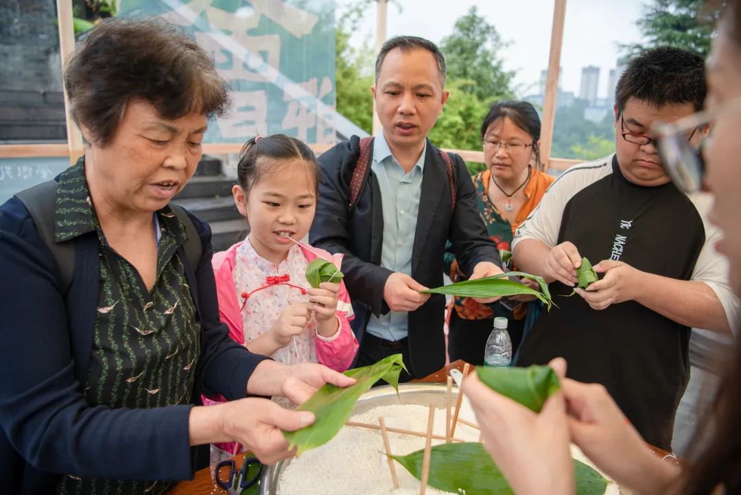 “大家包好的粽子可以带回家,请排队有序进行。”在包粽子体验活动现场,工作人员正在指导游客包粽子。现场,有小孩在家长的指导下共同包粽子,其乐融融。