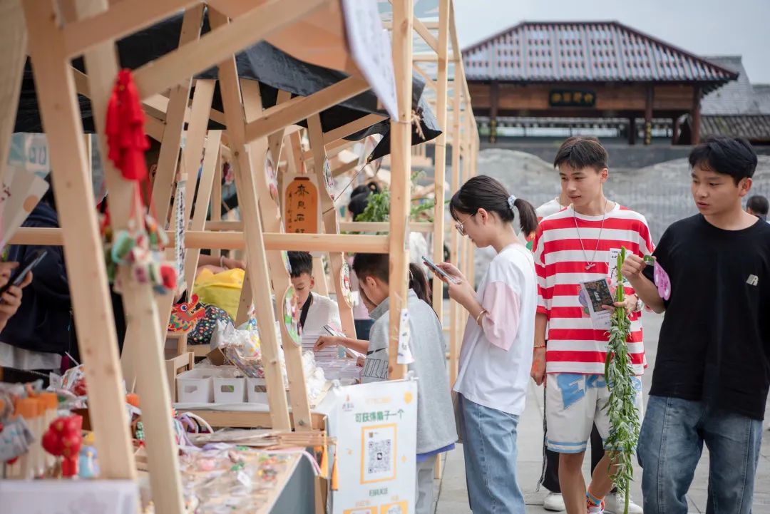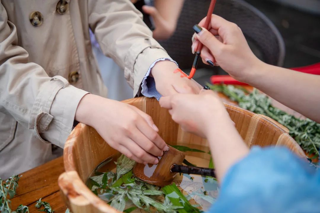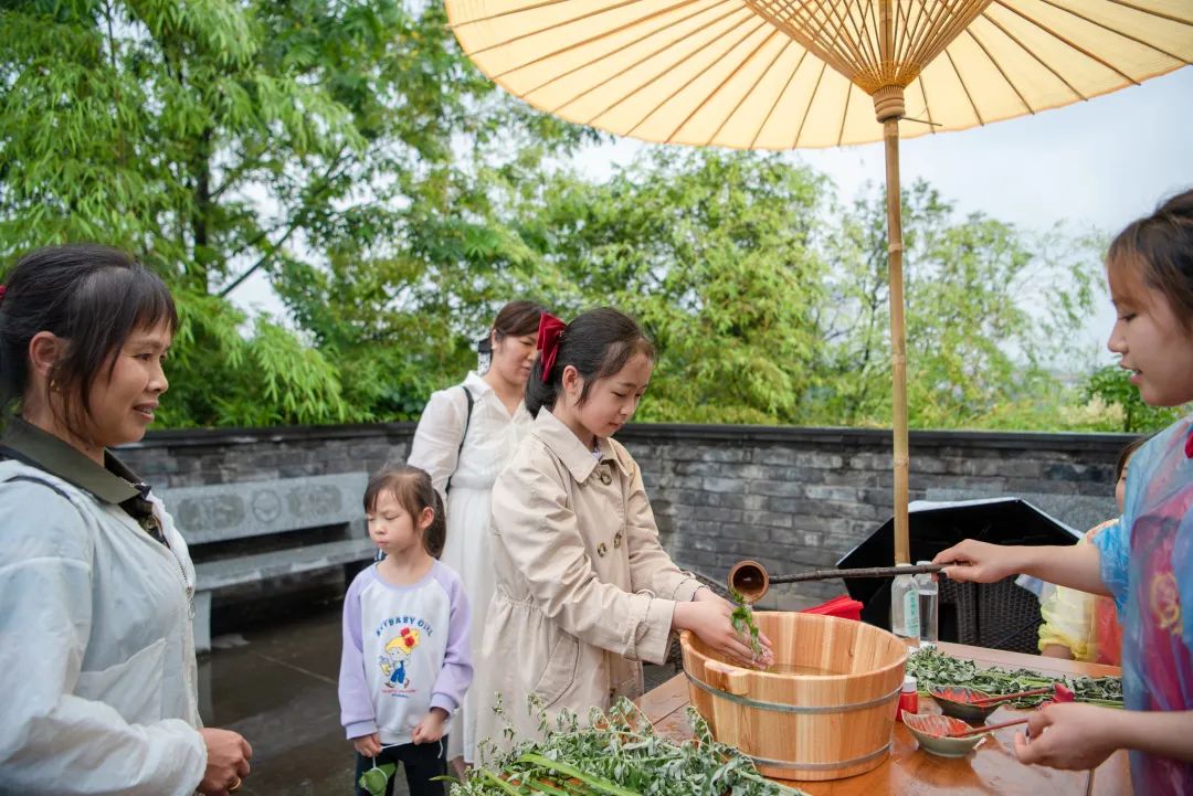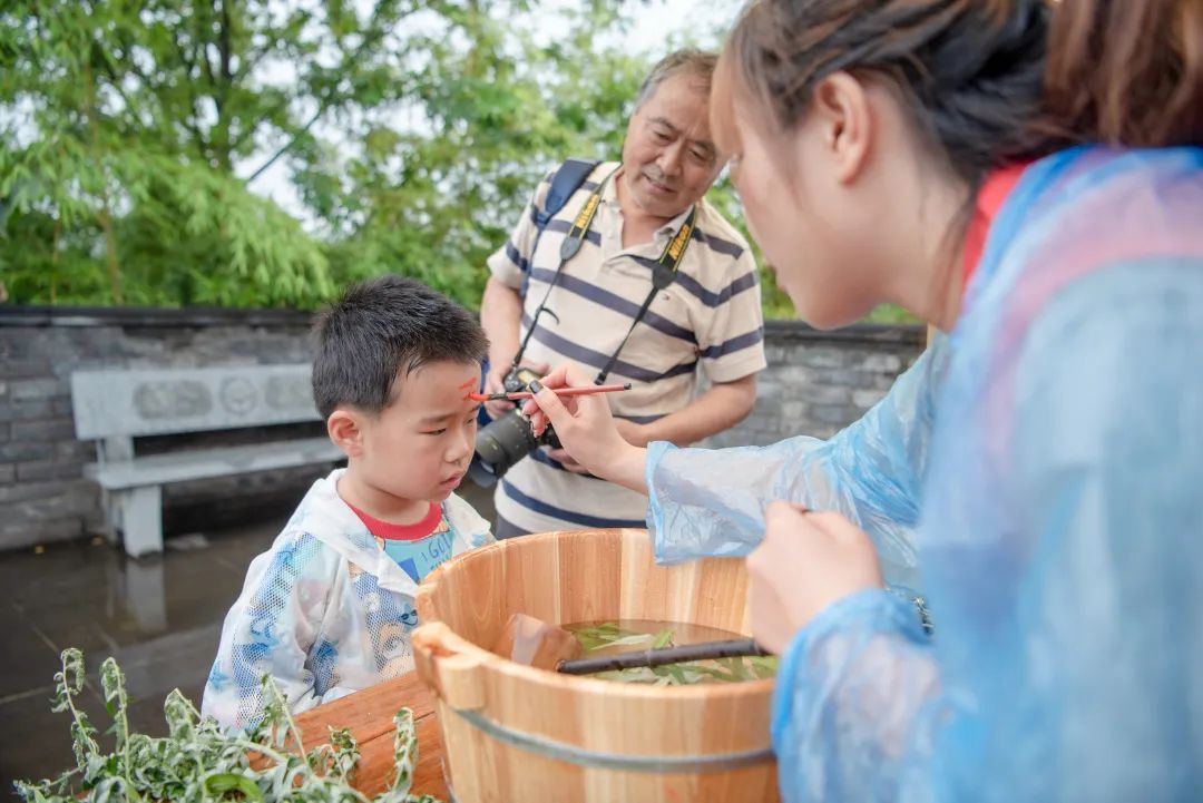 在孔学堂内,随处可见市民游客手中提着粽子、拿着艾草,不少市民游客手上或者额头上点上了雄黄,浓浓的端午味。在“端雅市集”区域,虽然下着小雨,但包粽子、点雄黄、沐兰汤、佩香囊、悬艾草、射五毒六大传统体验活动依然火爆,引来众多游客围观和体验。