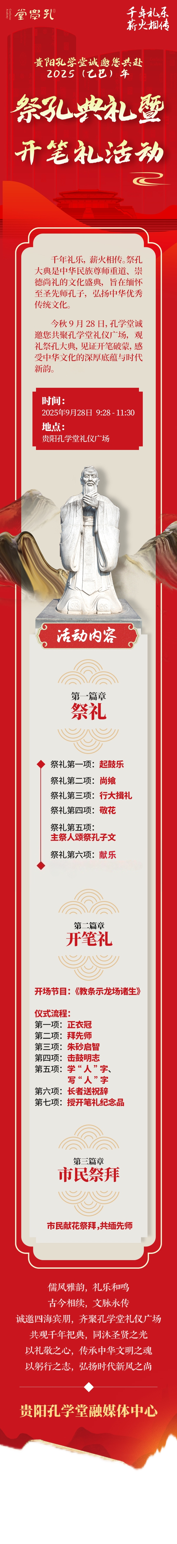 今年正值孔子诞辰2576周年。为传承中华优秀传统文化,弘扬尊师重教社会风尚,9月28日上午,贵阳孔学堂将在礼仪广场举行2025(乙巳)年“祭孔典礼”暨开笔礼活动,诚邀市民朋友亲临现场,共同参与这场文化盛宴。