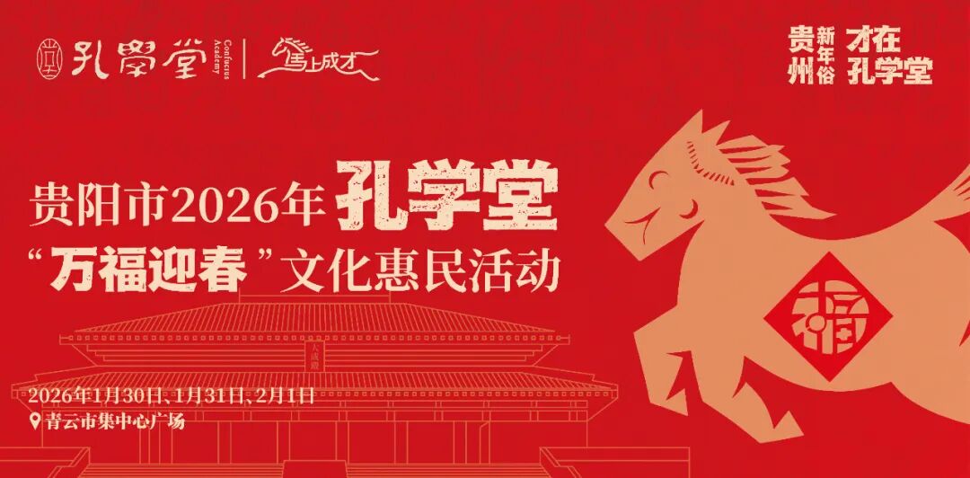 祥蛇盘福辞旧岁,骏马迎春启新程。孔学堂2026(丙午)年新春送福如约而至。1月30日-2月1日,孔学堂“万福迎春”活动将空降青云市集,为广大市民游客献上新春祝“福”,活动现场不仅集合了趣味满满的木版年画拓印、竹编马饰等非遗手作、藏着新春美好和吉祥寓意的文化年礼,还有三天不重样的主题音乐演出轮番上演!把启福·纳福·传福的氛围感拉满~