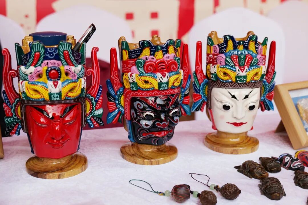 “匠心造福”非遗体验区的市民游客更是络绎不绝,欢声笑语不断。来自安顺的省级木雕非遗传承人胡发云的摊位前,各式木雕文创引人驻足:惟妙惟肖的迷你傩面具、古朴实用的傩面笔筒、生动传神的木雕摆件……胡发云热情介绍:“这些都是我们屯堡地戏文化的精髓,背后这些面具,有关公、孔明、刘备等经典人物。”现场最受欢迎的是傩面涂色和木雕小动物彩绘体验,大家手持画笔,认真地为素坯面具或可爱的木雕长颈鹿、小象赋予色彩——红脸的关公威严初显,蓝色的小象梦幻灵动,红色的长颈鹿活泼有趣。在“木头+颜料=无限创意”的“魔法公式”里,不仅能解锁动手的快乐,更在潜移默化中触摸到地戏这一千年非遗的密码。市民袁晓艺与朋友一同体验后感慨道:“作为贵州人,一直知道安顺地戏,但这样亲手参与、与年俗结合的形式特别棒!氛围感十足,还能让更多人了解并爱上它。”