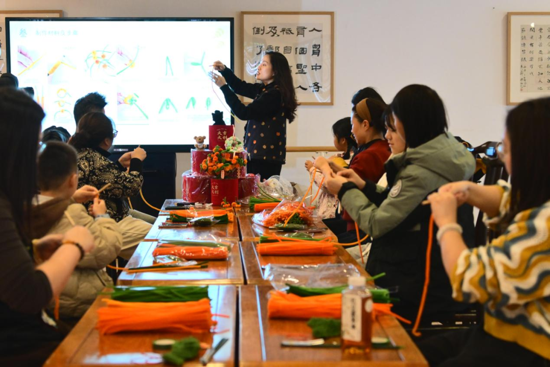 开课现场,孔学堂内年味氛围浓厚,参与市民围坐一堂,在专业手作老师的细致讲解与示范下,一步步完成抱抱桶的组装、搭配、柿子装饰等制作环节。大家认真裁剪、精心搭配,将寓意“事事如意”的柿子造型摆件、新春福字、喜庆花艺等元素融入桶身,每一个环节都饱含对新年的美好期许。不少亲子家庭携手创作,孩子与家长默契配合,在互动中感受传统年俗文化的魅力,现场欢声笑语不断,温馨又热闹。