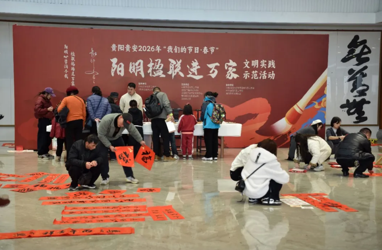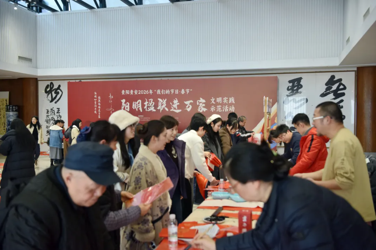 2月6日,贵阳孔学堂内人头攒动,喜气洋洋,贵阳贵安2026年“我们的节日·春节”——“阳明楹联进万家”文明实践示范活动分会场在此热闹开场。活动以“阳明心学润千载,楹联福瑞送万家”为主题,巧妙地将深邃的王阳明心学智慧,融入红火的春节楹联和移风易俗新风尚中,为新春添彩,为文明赋能。