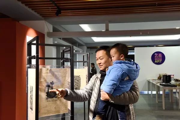 家长带着孩子参观画展